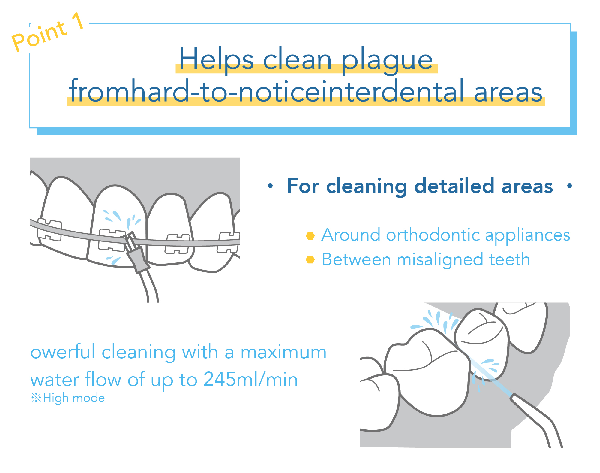 • Targets plaque in even the finest areas with the point brush nozzle!