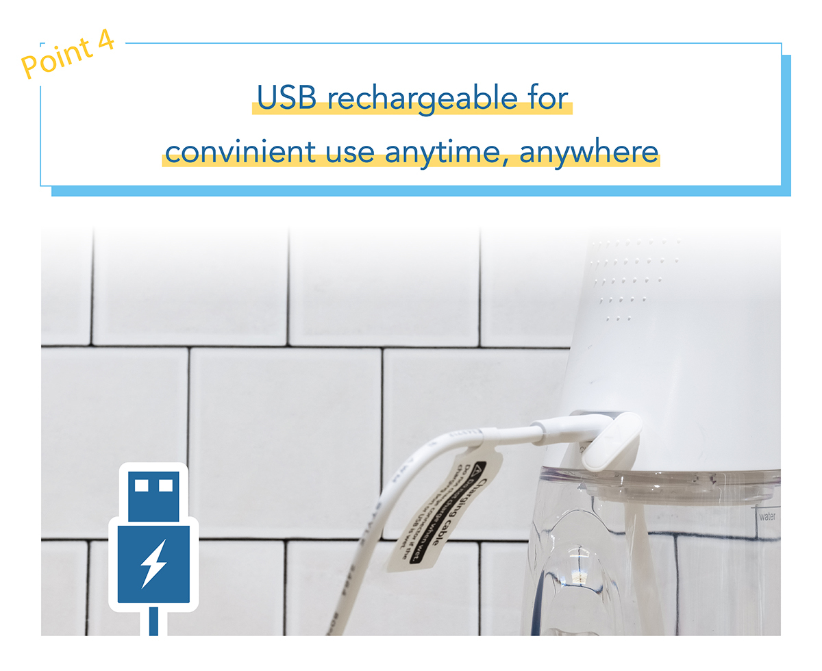• Accessories included: USB charging cable, standard nozzle, point brush nozzle