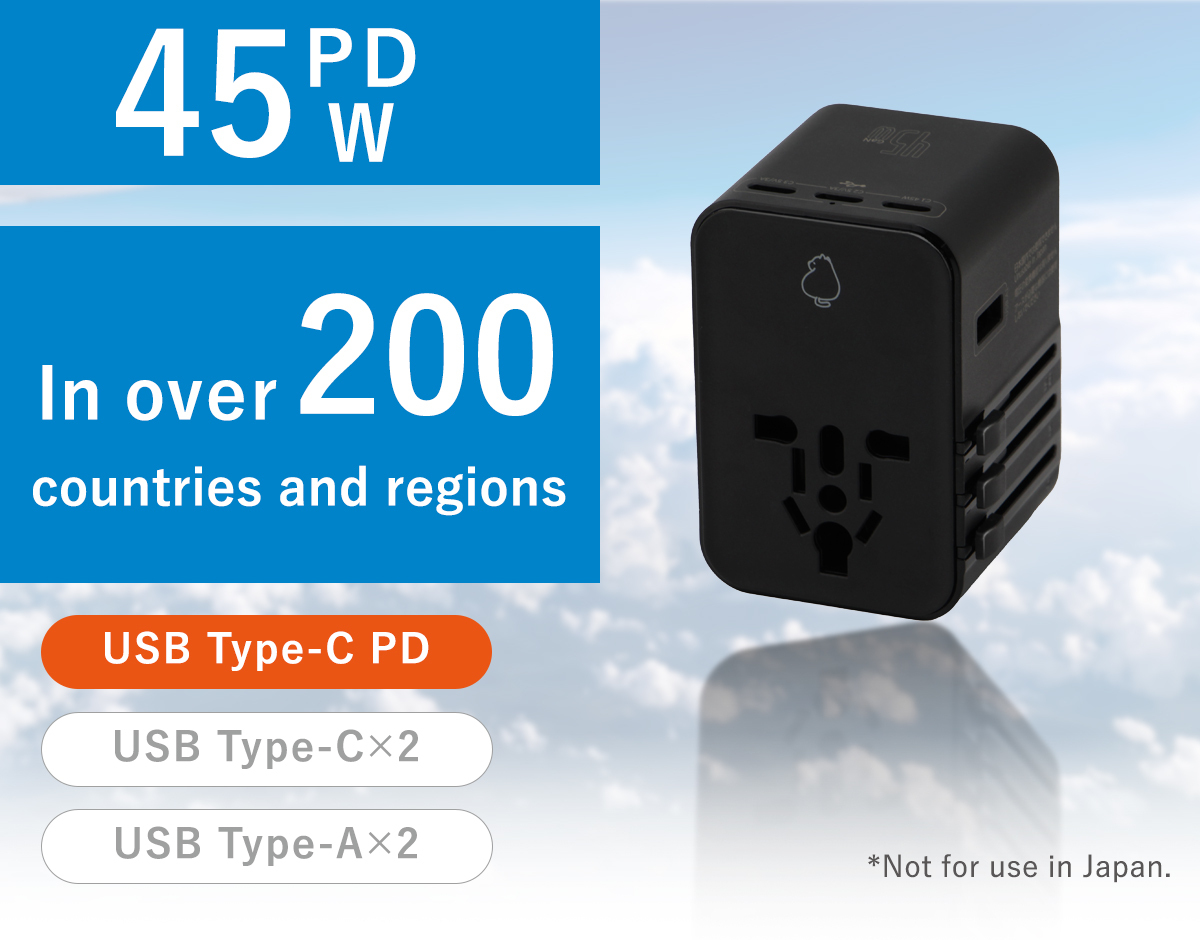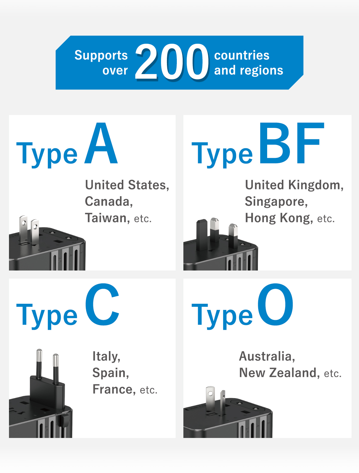 - Supports with 4 plug types for use in over 200 countries and regions