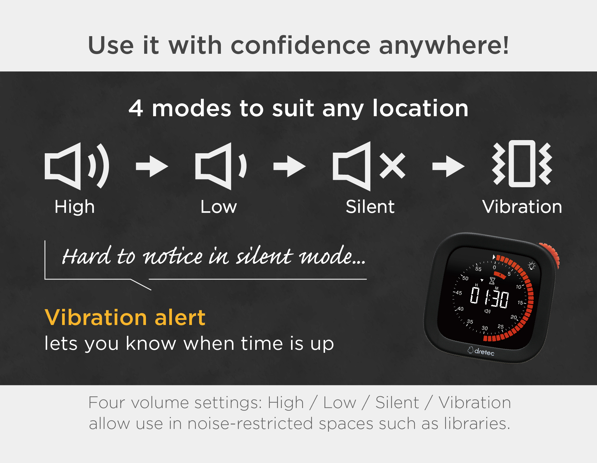 - Selectable alarm sounds (Loud / Soft / Silent / Vibration)