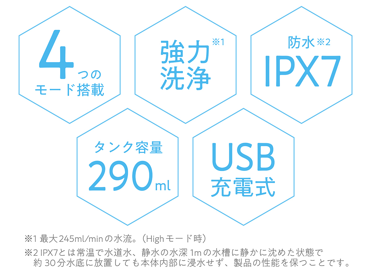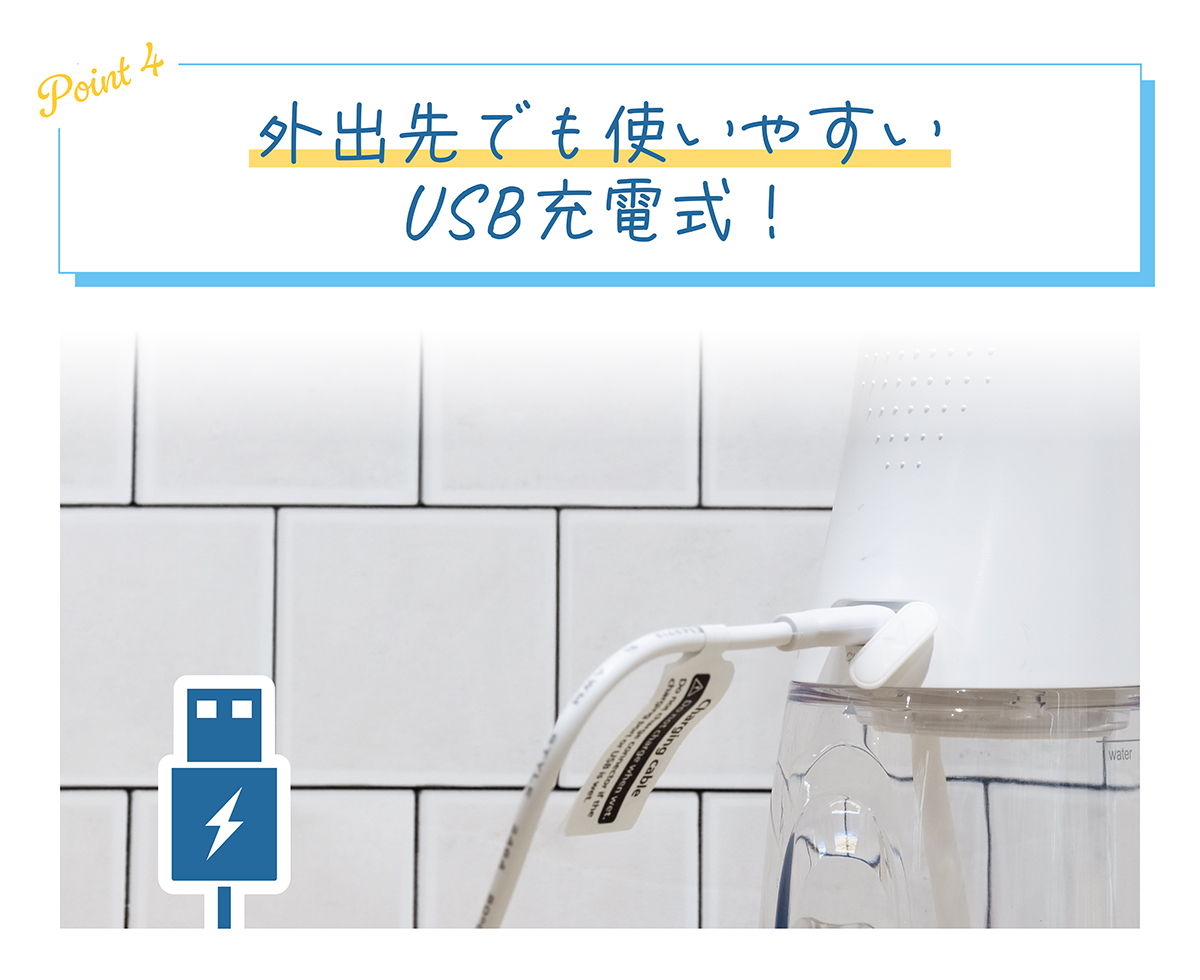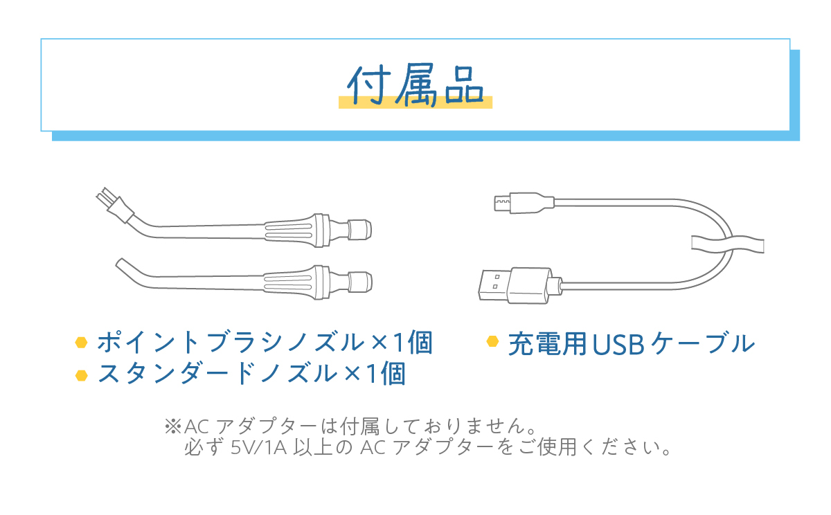 - 充電用USBケーブル/スタンダードノズル・ポイントブラシノズル各1個