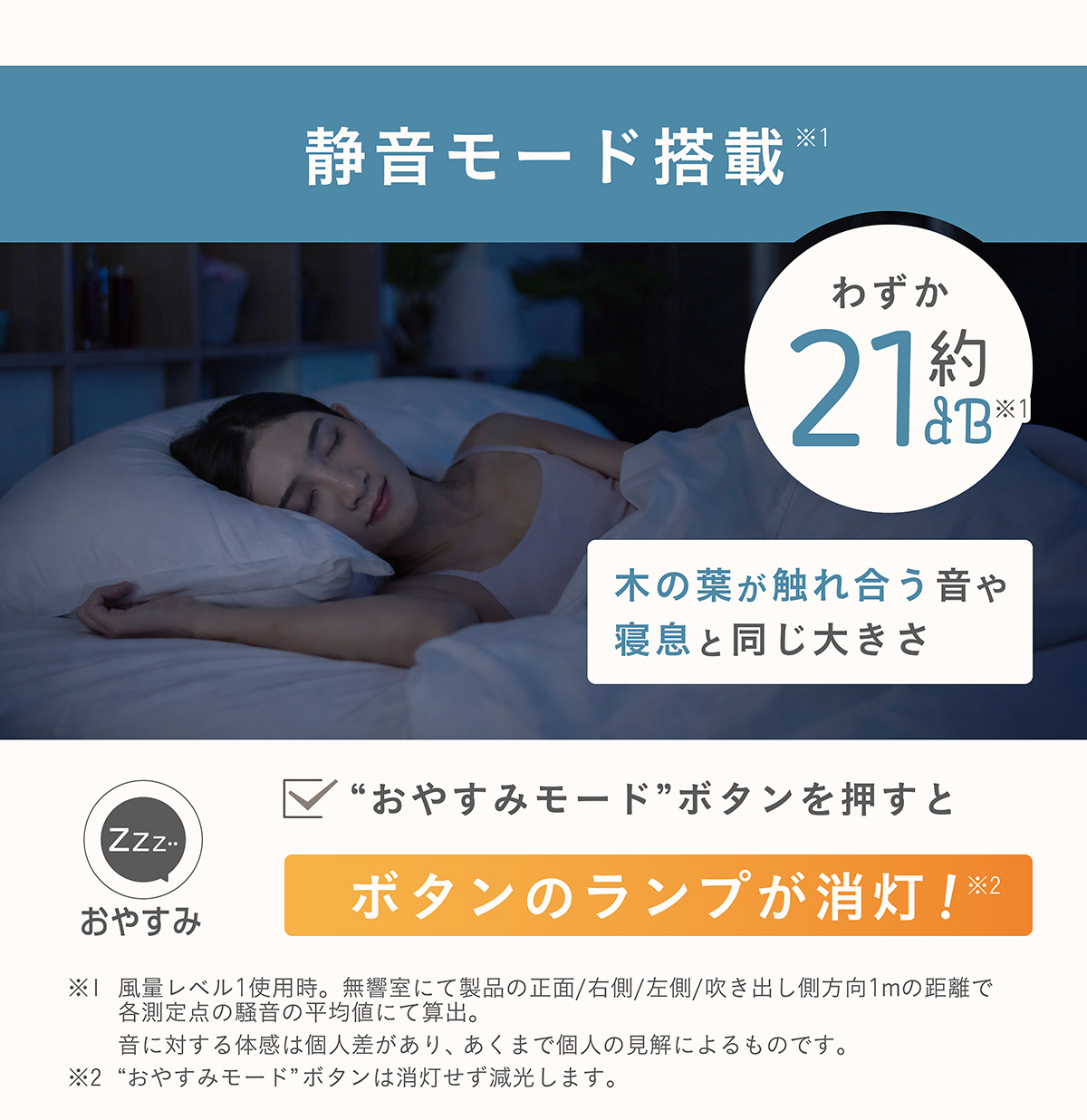 - 30dB以下の静音モード搭載※おやすみモード、風量1で起動時。自社試験で測定。