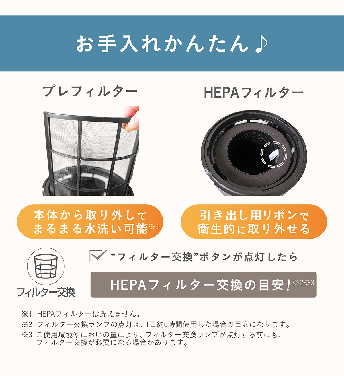 - 脱臭活性炭を練り込み 脱臭機能を強化した特別製HEPAフィルターを使用