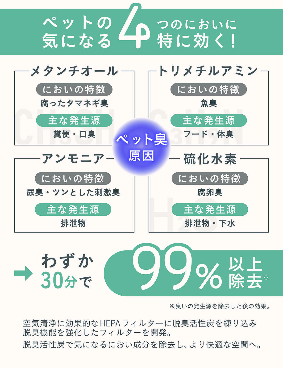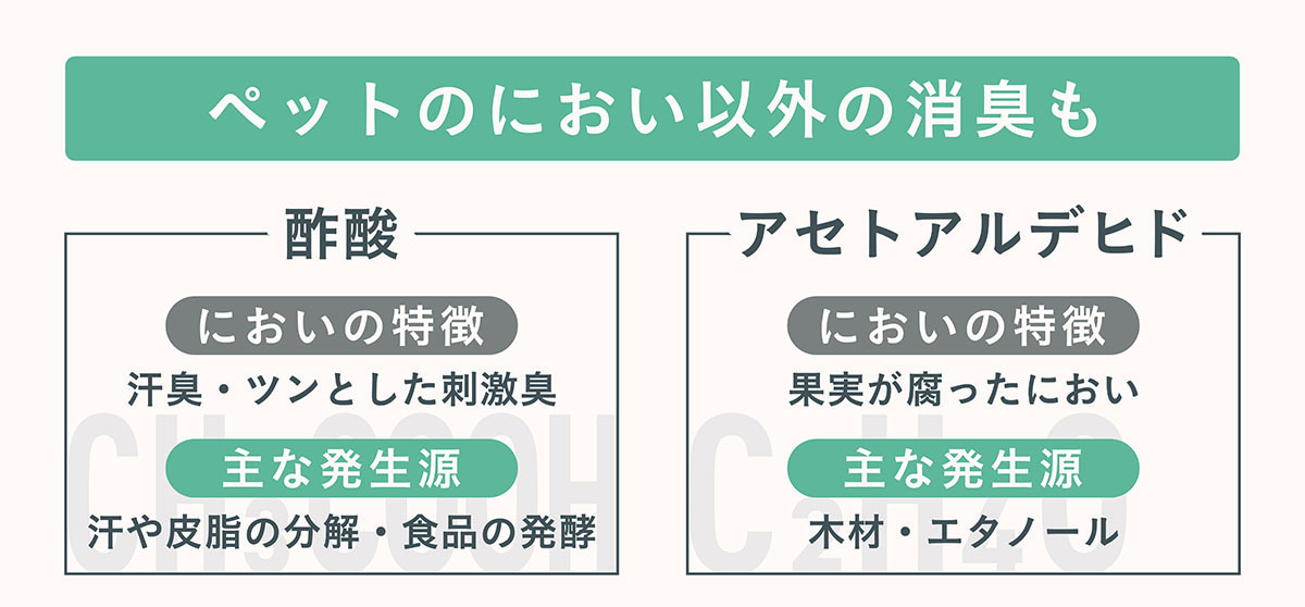 - ペット臭の原因である「アンモニア」「メタンチオール」「硫化水素」「トリメチルアミン」のにおいに特に効く!