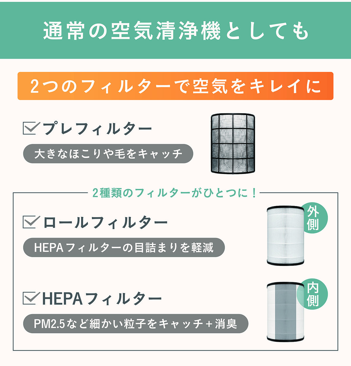 - 脱臭活性炭を練り込み 脱臭機能を強化した特別製HEPAフィルターを使用