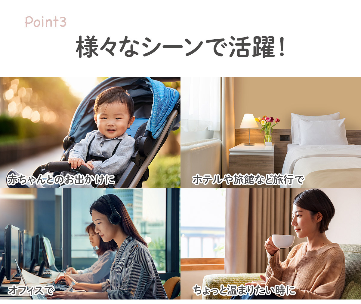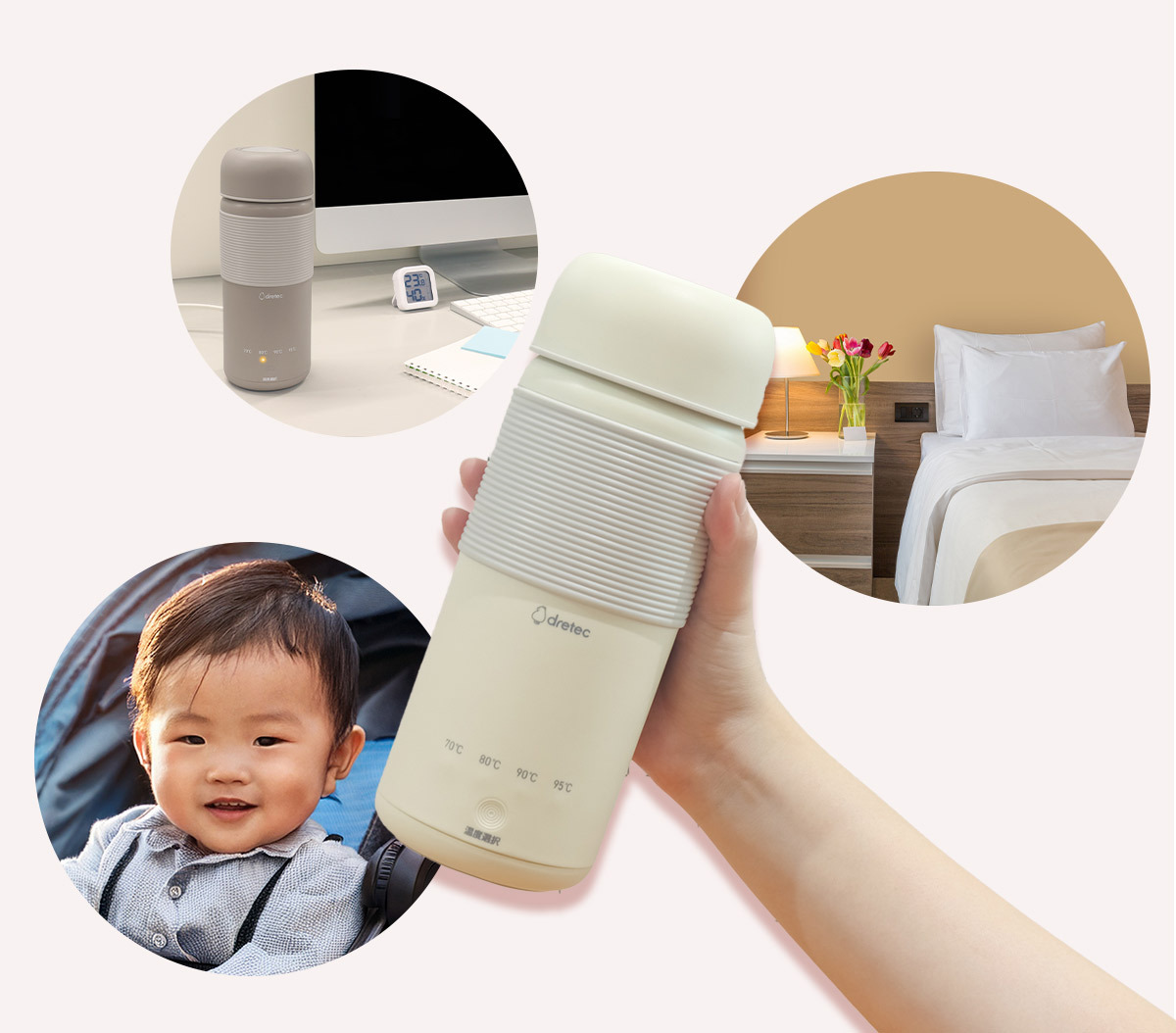 赤ちゃんのミルクから旅先のドリンク、オフィスのマイケトルなど、幅広くご使用いただけます。