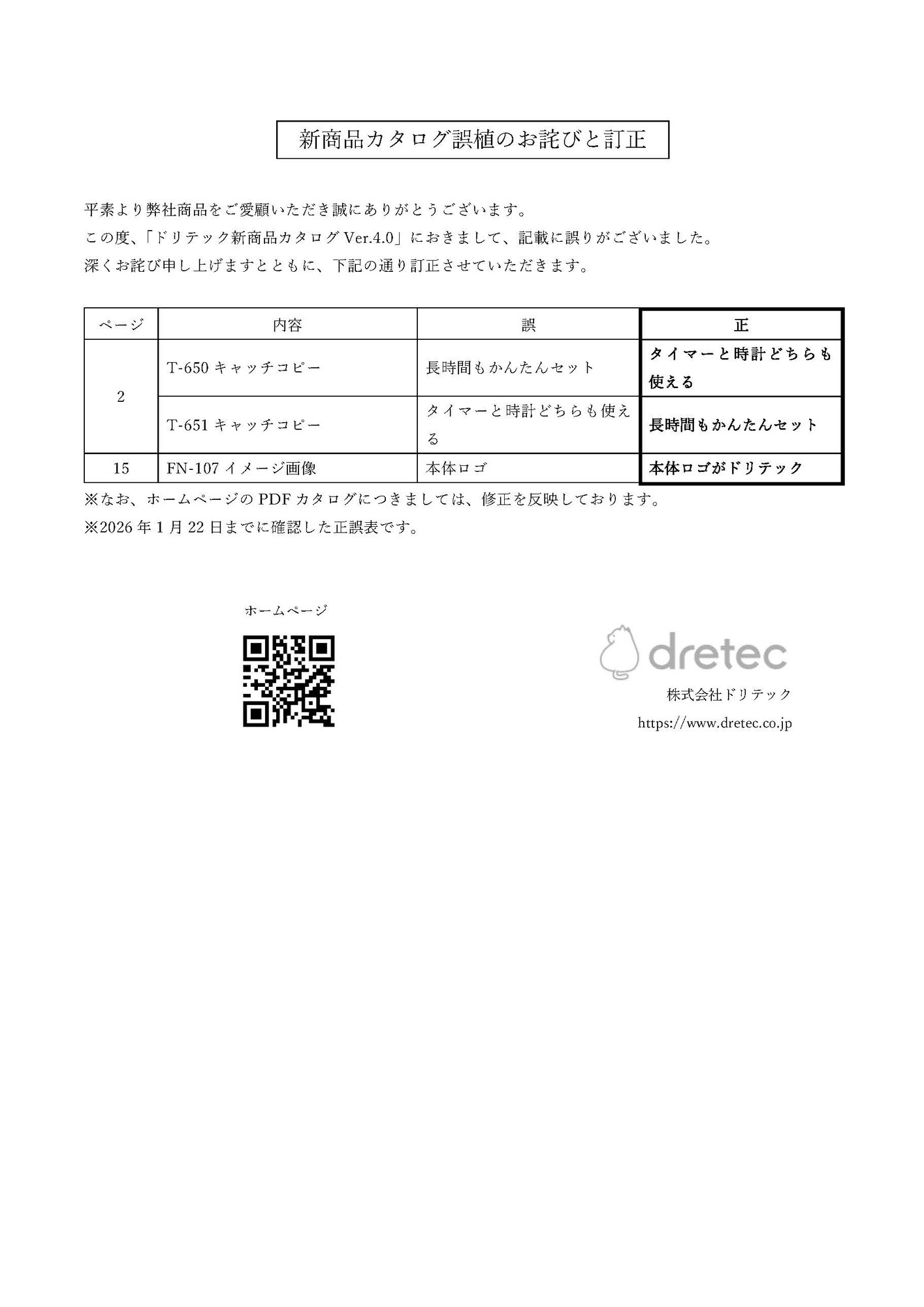 「新商品カタログ Vol.4.0」カタログ誤植のお詫びと訂正