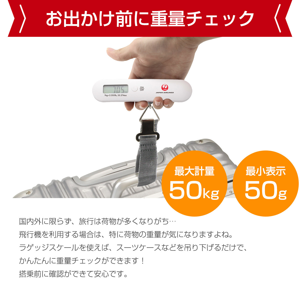 日本航空のロゴ入りモデル!手荷物の重量オーバー防止に